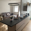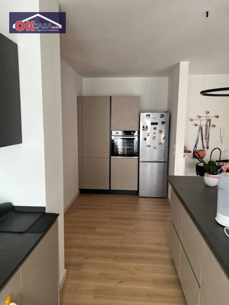 Lingresso si apre sulla zona giorno in open space con cucina e soggiorno: un ambiente luminoso e lineare, impreziosito dalla nicchia laterale con colonne frigo che libera superficie utile e rende la composizione darredo più pulita e contemporanea.