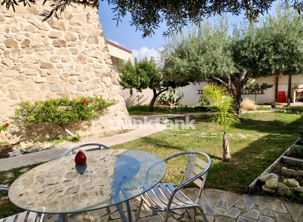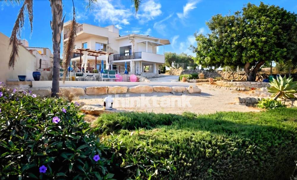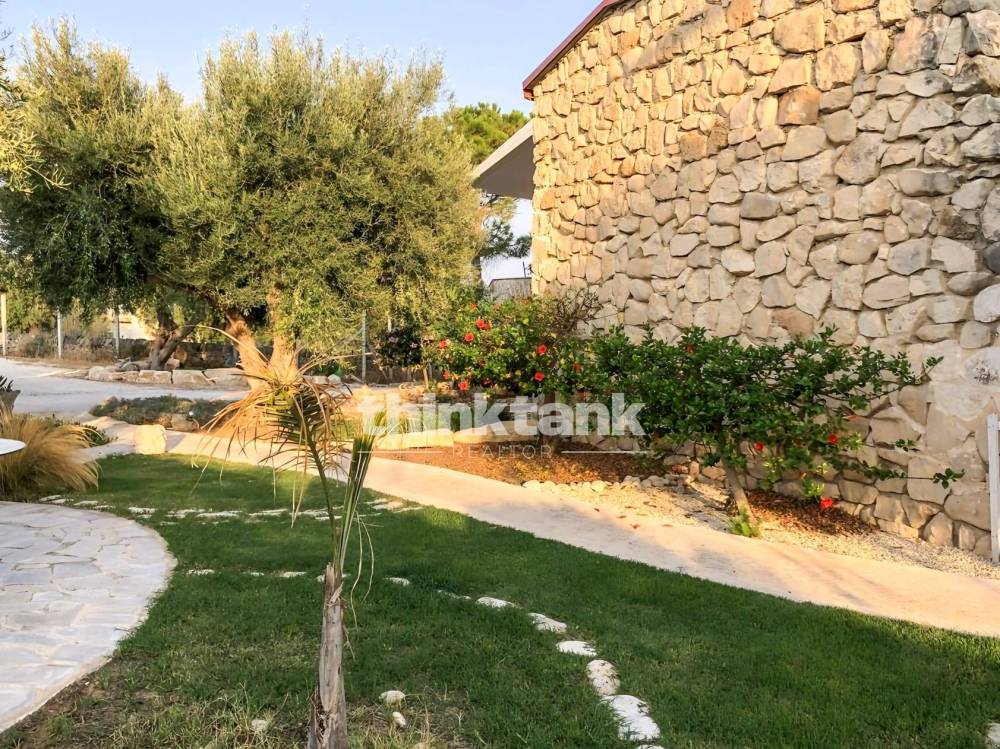Lintero terreno di circa 1.800 mq, recintato da un caratteristico muro a secco e rete metallica, è arricchito da ulivi, carrubi, alberi da frutto, cipressi e palme. La villa si trova in un contesto naturale e tranquillo, ma a soli 650 metri da spiaggia, bar, ristoranti e servizi.