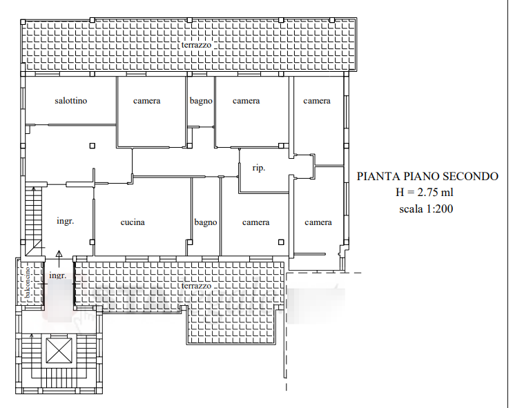 L'appartamento si sviluppa su più livelli ed è composto da ingresso con scala interna in legno che conduce alla soffitta, disimpegno della zona giorno, salotto, soggiorno con cucina, disimpegno della zona notte, cinque camere da letto, due bagni e un ripostiglio. Completano l'abitazione due terrazze, una esposta a sud e l'altra a nord. La soffitta, posta al terzo piano sottotetto, è un ampio ambiente aperto, accessibile tramite un disimpegno.