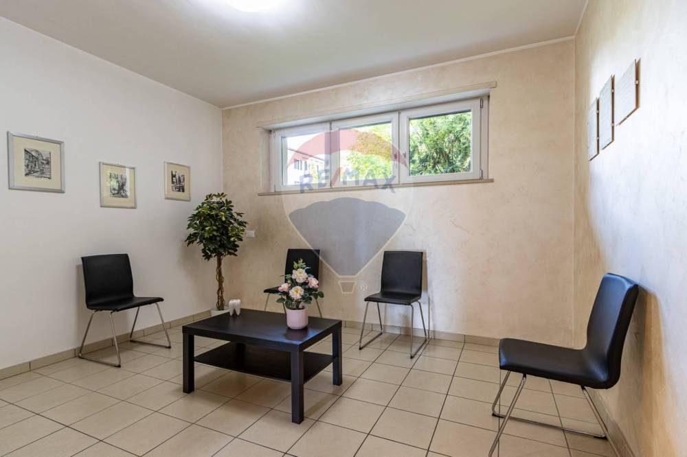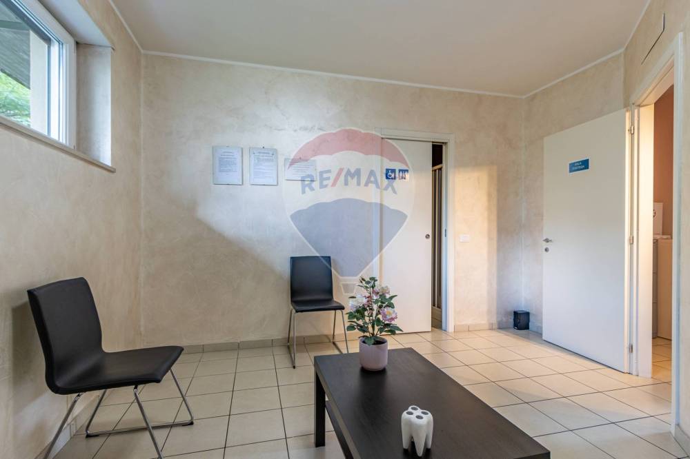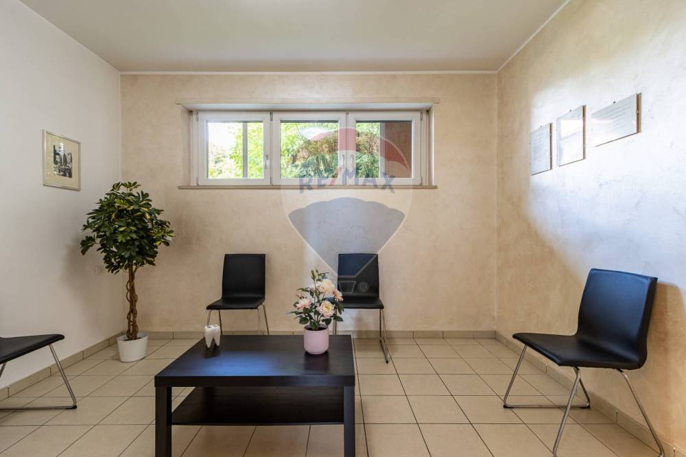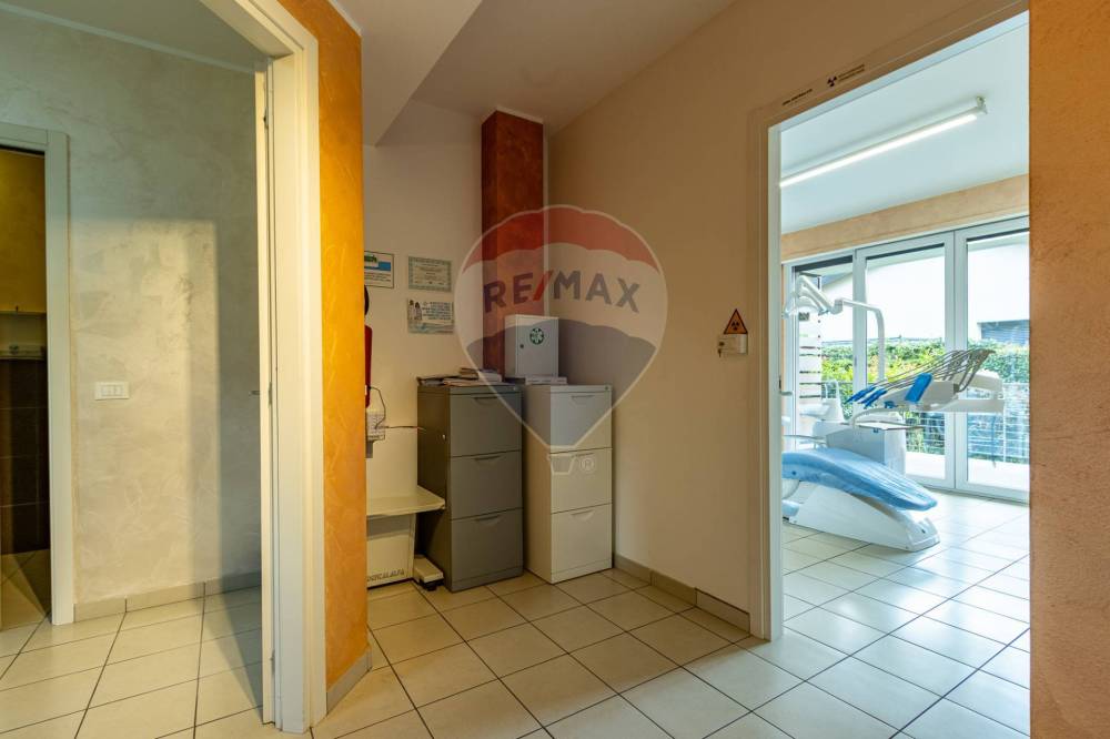 Lo studio si compone di reception con sala d’attesa, ampia sala operativa con poltrona, bagno per i pazienti e scala interna che conduce alla zona seminterrata, dove si trovano un secondo bagno riservato al personale, locale archivio e ripostiglio.