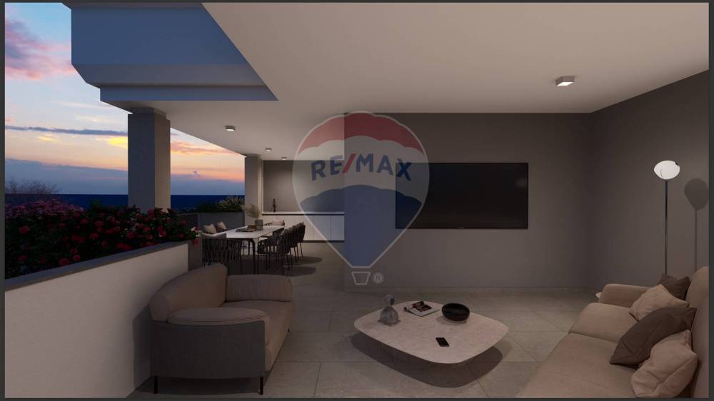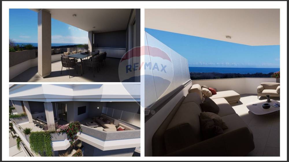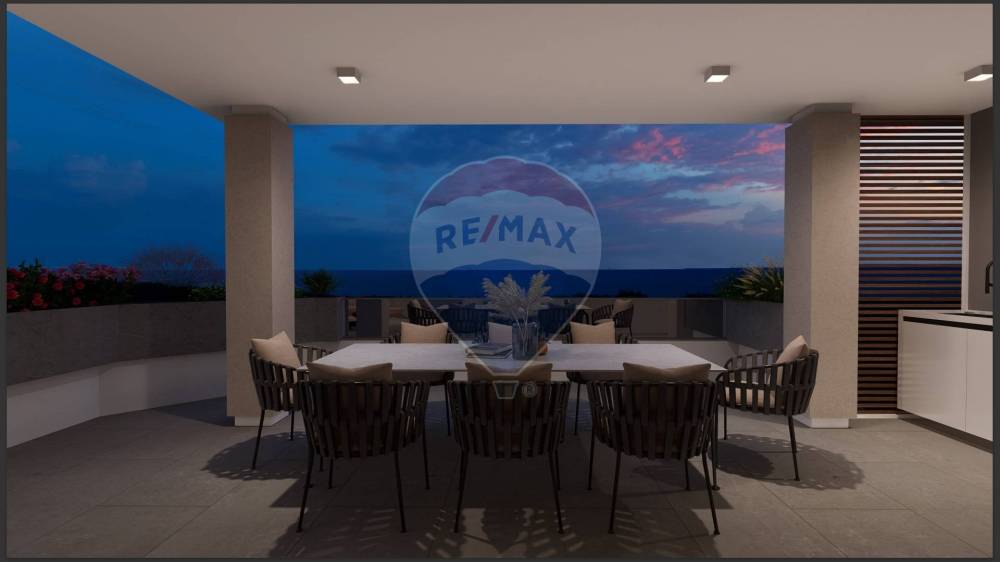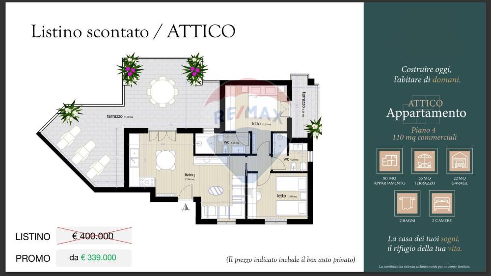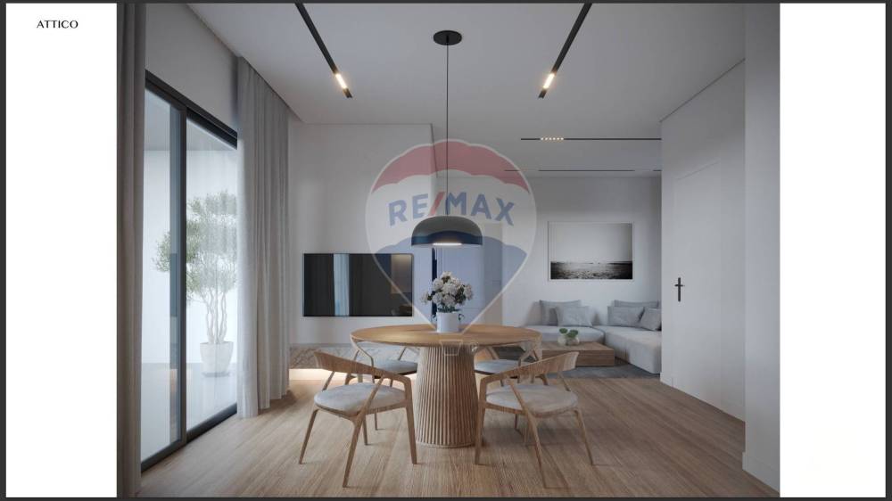 Attico di mq 80 coperti con ampia zona living dotata di ampie vetrate con bellissima vista sul lato mare e bosco. Due camere da letto e doppi servizi con ampi terrazzi di 55 mq.