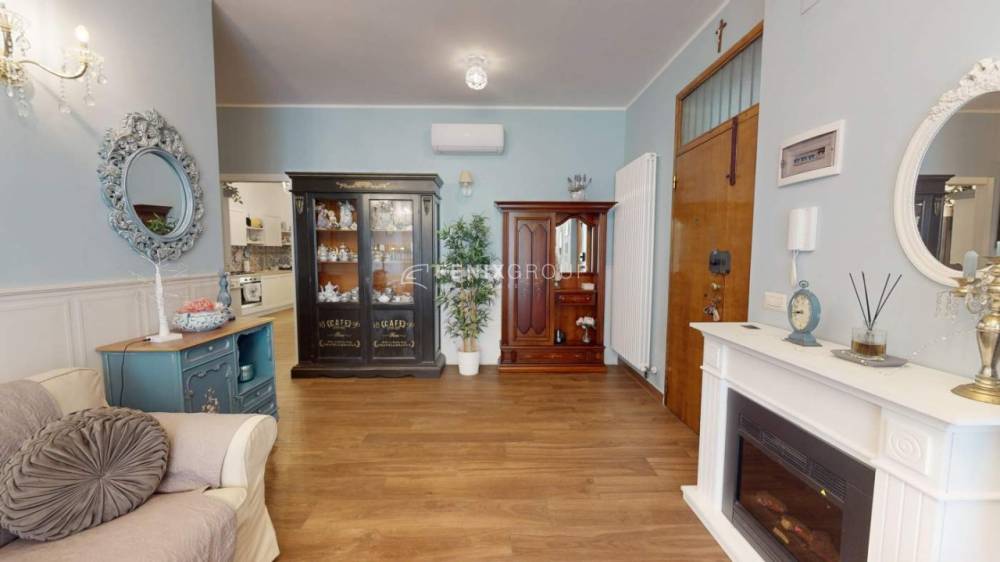 L’ingresso si apre su un accogliente soggiorno con camino elettrico, ideale per creare un’atmosfera calda e conviviale, con accesso diretto a un ampio terrazzo abitabile, perfetto per momenti di relax all'aperto o cene in compagnia, inoltre, sul terrazzo troviamo una lavanderia, comoda e funzionale.