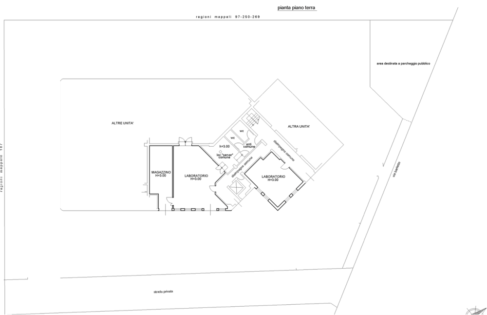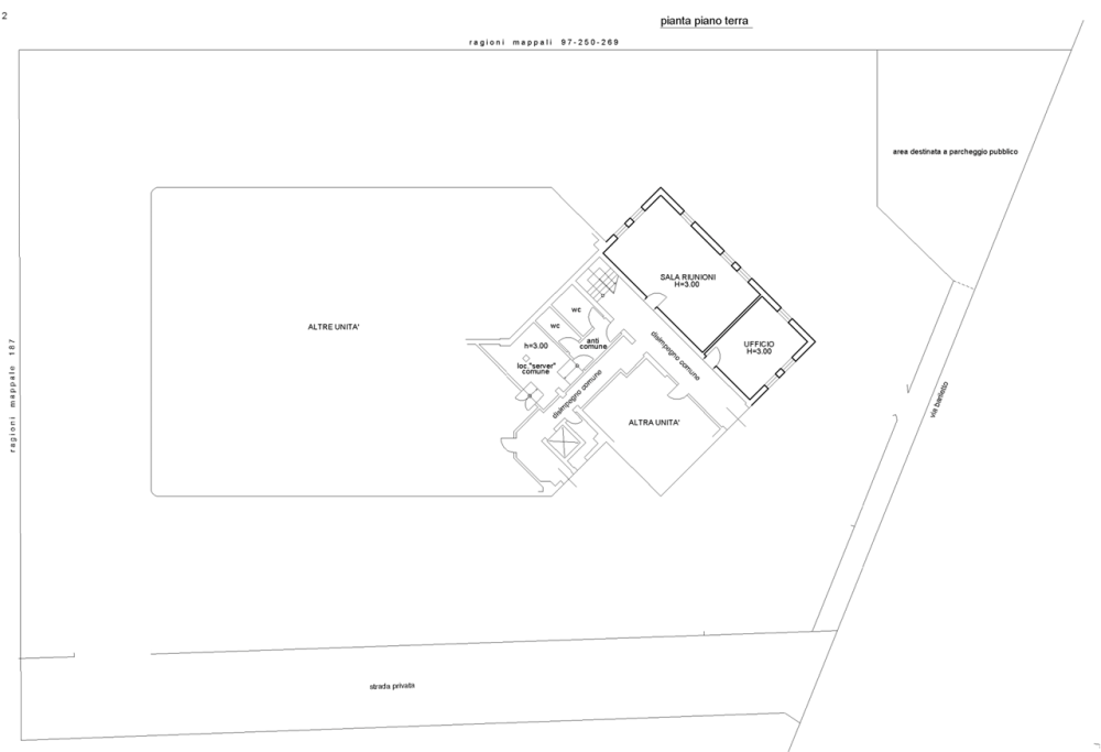 -Ufficio  420 mq Ingresso al piano terra con due ambienti destinati a ufficio e sala riunioni. Al piano primo, accessibile tramite vano scala e ascensore, si sviluppano numerosi spazi ideali per attività direzionali: corridoio comune con accesso a un archivio e ai servizi igienici, blocco nord: tre uffici, blocco centrale: due uffici, archivio e deposito, blocco est: tre uffici e un ulteriore servizio.