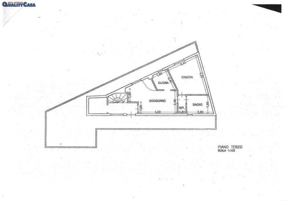 - Appartamento piano terzo: ingresso, soggiorno con camino, cucinotto, camera, bagno, ripostiglio, balcone perimetrale, terrazzo e posto auto esterno.