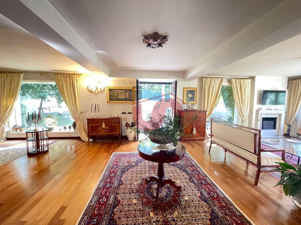 Al piano sottostante, dove si accede anche tramite scala interna in legno massello, si sviluppa la zona a servizio diretto del rigoglioso giardino composta da salone doppio con camino, cucina tinello, bagno padronale con vasca e ripostiglio.