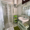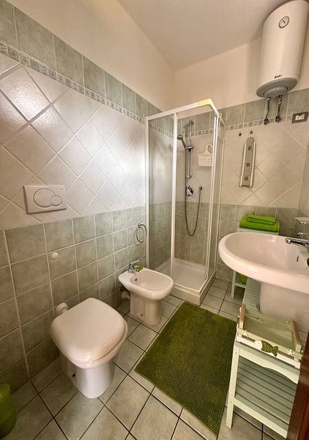 - Un monolocale con angolo cottura e bagno con box doccia.