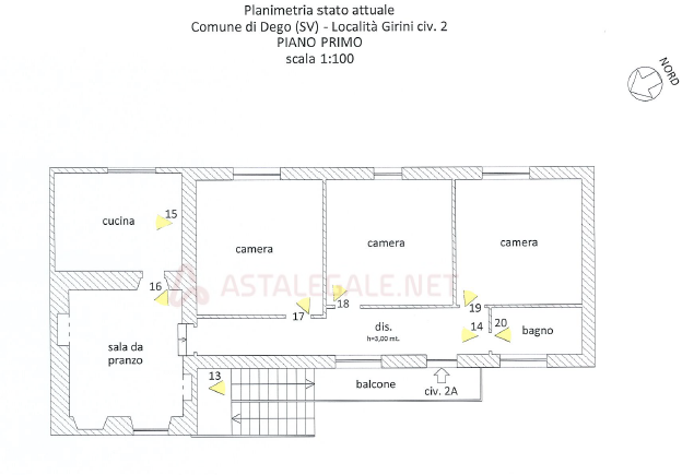 L'unità immobiliare, posta al piano primo ed avente altezza interna pari a mt. 3,00 circa, è composta da disimpegno, cucina, n° 4 camere e bagno.