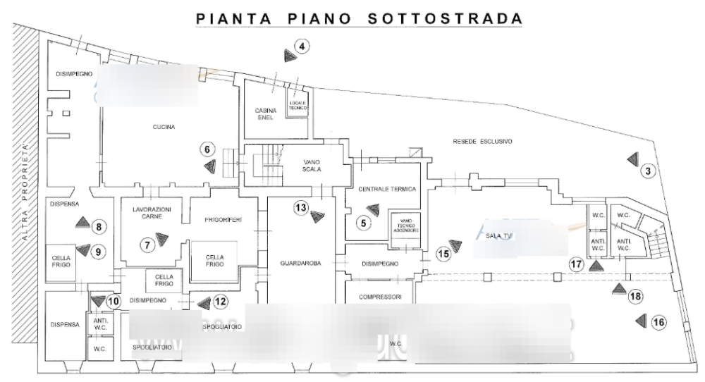 spogliatoio, guardaroba, servizi igienici, centrale termica, cabina Enel, disimpegni, vano tecnico per l'ascensore e vano scale. Sono inoltre presenti: