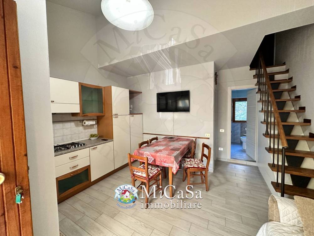 Composto al primo piano da ingresso in soggiorno con angolo cottura, bagno con box doccia e camera media con letto matrimoniale . Al piano soppalcato troviamo camera e bagno di servizio.