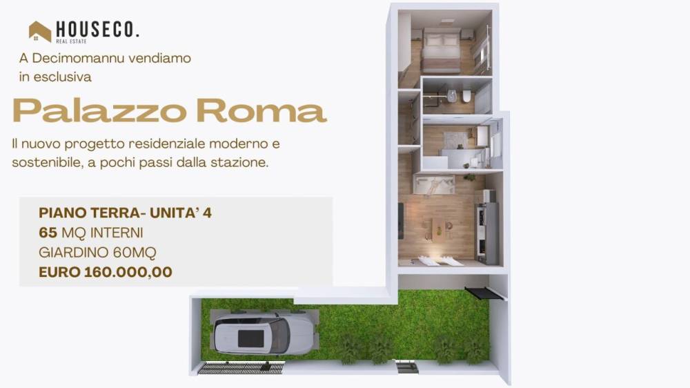 Nasce a Decimomannu "Palazzo Roma", il nuovo progetto residenziale moderno e sostenibile, a pochi passi dalla stazione, vicino a tutto e lontano dal caos, 13 minuti di treno da Cagliari. Trilocali con giardino o terrazza, con cantina e garage, finiture eleganti e tutte le comodità per la tua nuova vita. PIANO TERRA Al piano terra del condominio si trovano 5 unità abitative, è rimasto disponibile un solo appartamento con giardino al prezzo di euro 160.000,00. Misura internamente 65mq composto da ingresso soggiorno con zona cottura camera singola bagno e camera matrimoniale, giardino privato di 60mq. L' appartamento è progettato per essere efficiente e smart, le dotazioni incluse sono impianto fotovoltaico, condizionatori, scaldaacqua a pompa di calore, tapparelle motorizzate. Per chi ha bisogno di spazi extra può abbinare il garage e/ la cantina. Prezzo Euro 160.000,00 Contattaci per fissare un appuntamento e avere tutte le risposte alle tue domande. Consegna prevista Dicembre 2026
