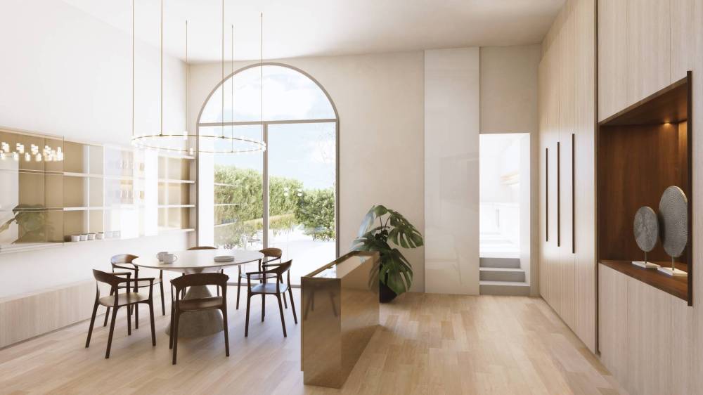 La distribuzione interna prevede tre camere da letto, doppi servizi e ampie zone giorno che si affacciano sul verde privato.
