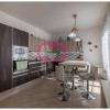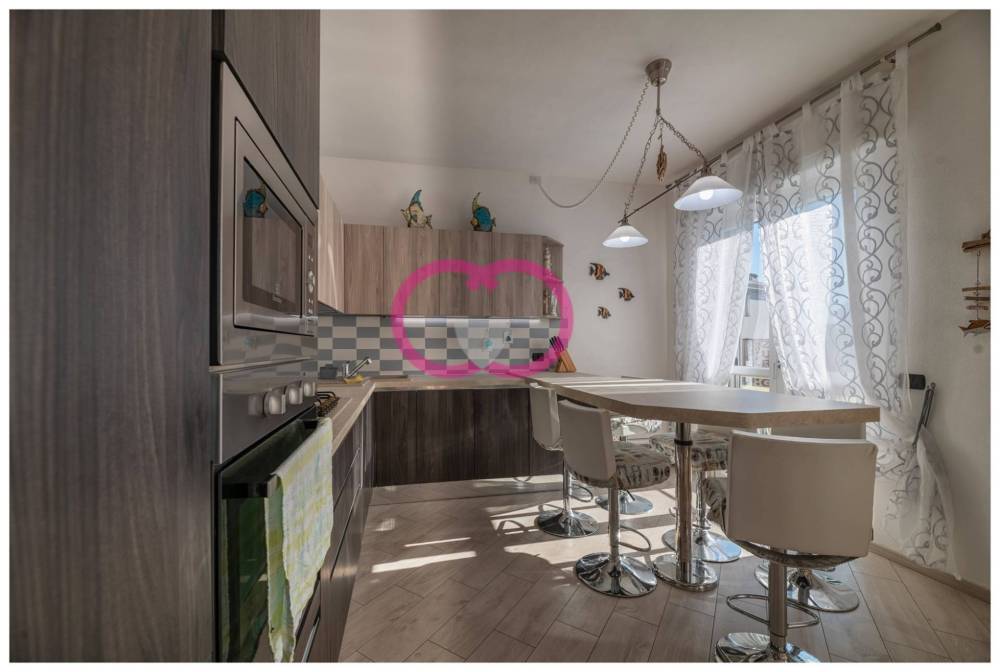 La luce entra dalle ampie finestre e accompagna lo sguardo verso il soggiorno con cucina a vista, un ambiente pensato per vivere: la penisola invita alla convivialità, lo spazio è arioso e curato, e la balconata che gira intorno allappartamento regala respiro e continuità agli ambienti.