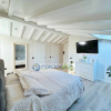 An internal staircase connects to the upper floor, where a beautiful master bedroom with exposed wooden beams unfolds, complete with a walk-in wardrobe and en-suite bathroom.