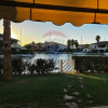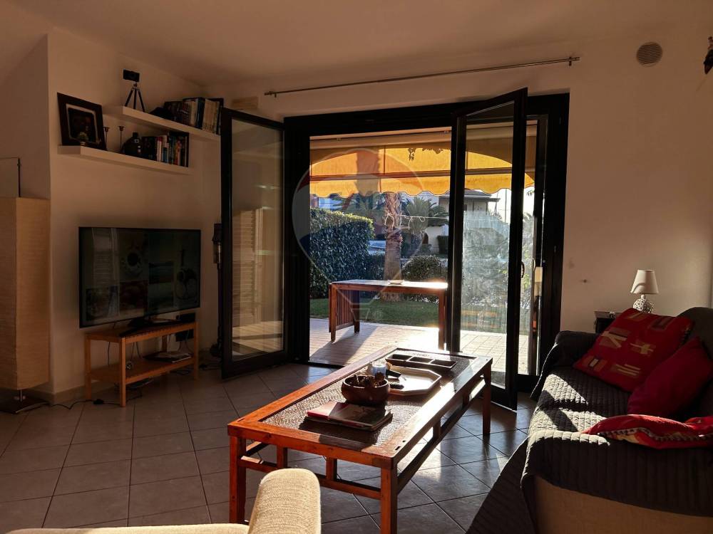 Lingresso riservato si apre su un luminoso open space dove soggiorno e sala da pranzo dialogano con il grande patio coperto e il giardino affacciato sullacqua.