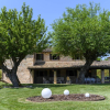 Il casale, con suggestiva facciata in pietra rosa locale, è stato oggetto di un accurato restauro che ha mantenuto elementi autentici come travi in legno a vista e pavimenti in cotto, arricchendoli con dettagli contemporanei.
