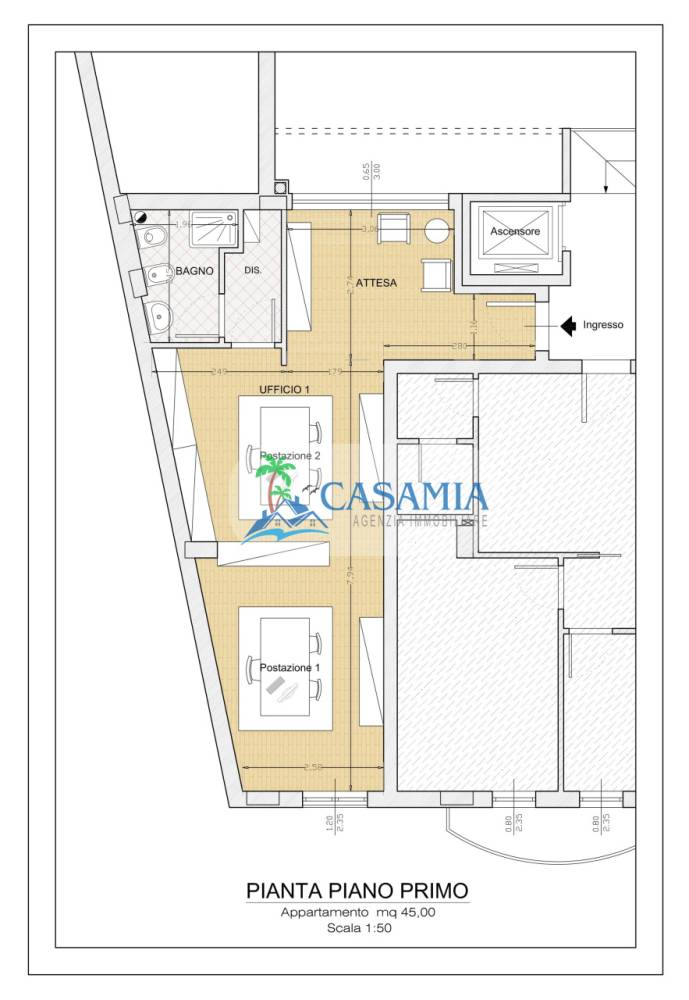 SAN BENEDETTO DEL TRONTO (AP) Codice Agenzia 1336 Nelle vicinaze dell'Ospedale civile in palazzina del 2005 visibile su strada principale, monolocale adibito ad uso ufficio posto al piano 1° servito da ascensore. L'unità immobiliare gode di un'unica esposizione a sud, ha una superficie coperta di circa 45 mq e si compone di un ingresso-reception, un grande vano finestrato ed un bagno con antibagno ad aerazione forzata. Ottime rifiniture, impianto di aria condizionata caldo-fredda, pavimentazione in parquet, infissi in PVC con doppio vetro, persiana in alluminio, videocitofono e portoncino blindato. Possibilità di personalizzare il monolocale in base alle proprie esigenze. Si valutano solo conduttori referenziati. Agenzia Immobiliare CasaMia.