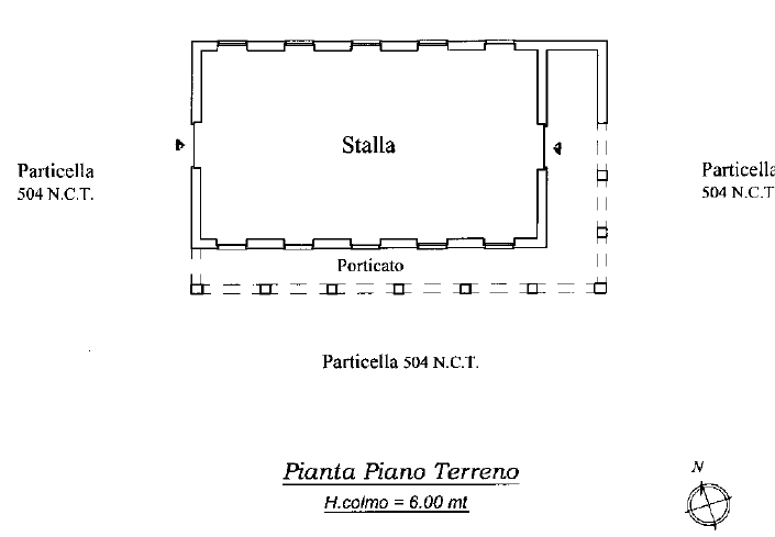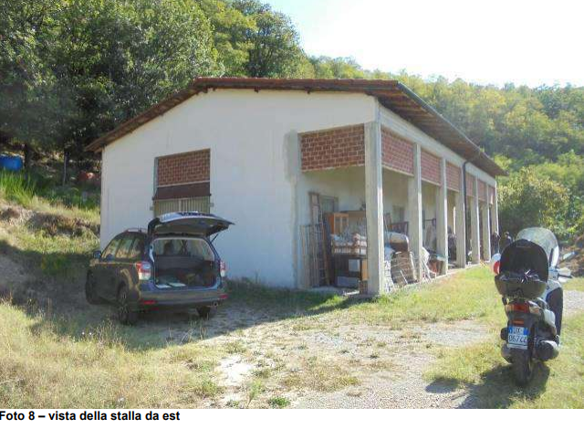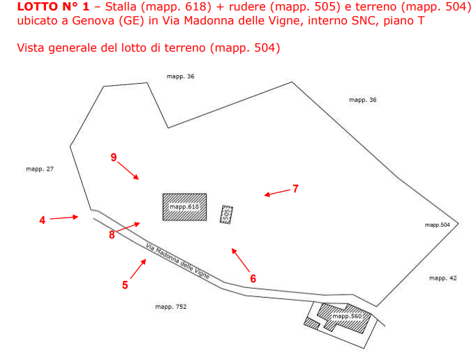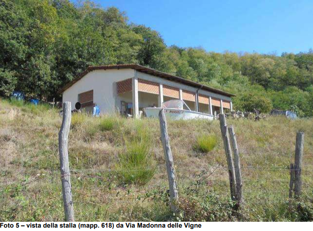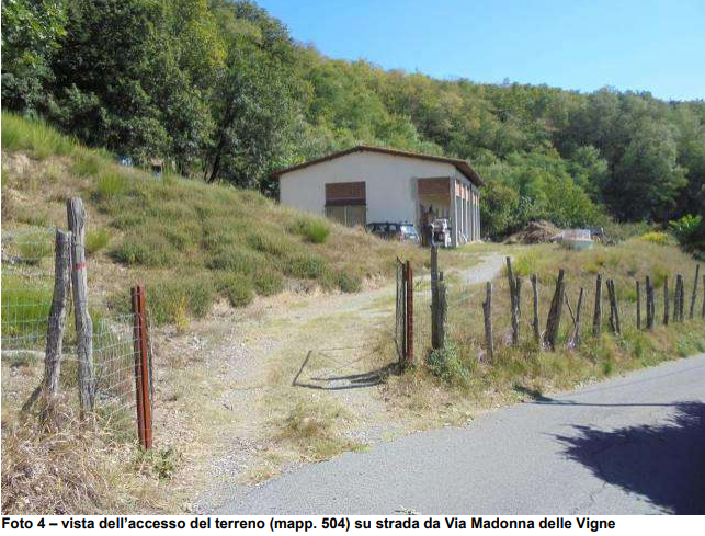 Lotto 1 posto a monte di Via Madonna delle Vigne composto da un terreno (particella 504 di qualità seminativo arborato) dove è posizionata una stalla (particella 618  categoria catastale C/6) e un rudere (particella 505 considerabile fabbricato diruto).