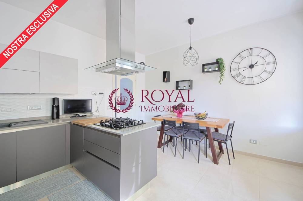 Lingresso conduce in una spaziosa sala accogliente e raffinata, con accesso al balcone affacciato sulla chiostra interna. La cucina abitabile, dotata di penisola e accessoriata, regala uno spazio conviviale unico, arricchito da un secondo balcone. A completare la zona giorno un pratico ripostiglio.