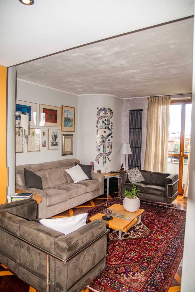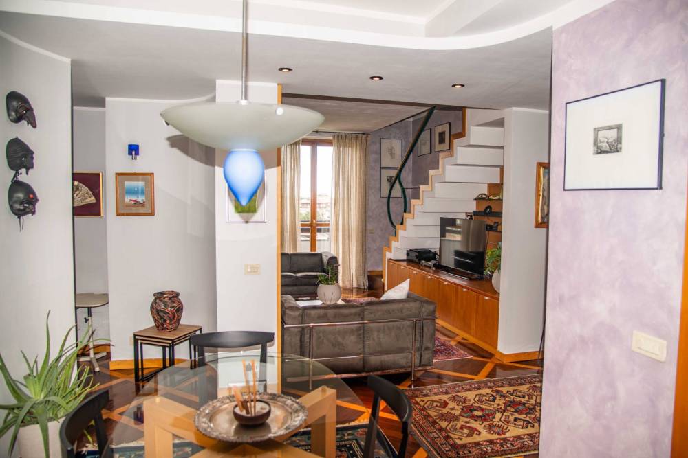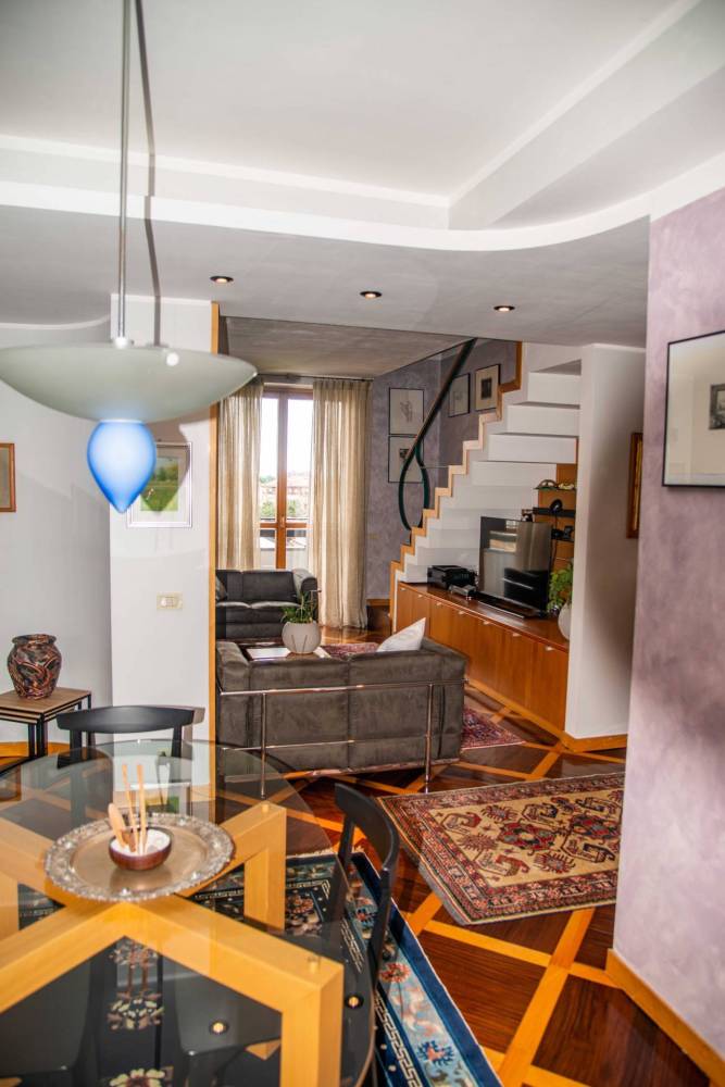 Rho zona San Carlo. In signorile condominio immerso nel verde proponiamo stupendo attico di generose dimensioni disposto su due livelli. Al piano 5° ingresso, soggiorno con zona pranzo, cucina abitabile, le due camere da letto. Due bagni finestrati ed un ripostiglio completano il piano principale. Balconi e terrazzino. Una scala interna in muratura rivestita in legno porta al piano superiore mansardato composto da un secondo soggiorno con camino, uno studio, un ripostiglio ed una lavanderia oltre ad un terrazzo di mq. 28. Completano la proprietà una cantina e la possibilità di un box singolo ed un ampio box doppio.
