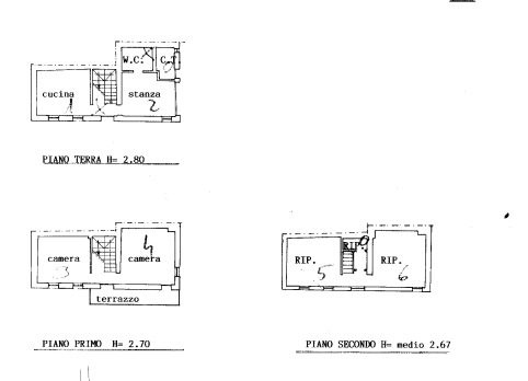 Unità di medie dimensioni sviluppata su tre livelli fuori terra, facente parte di un più ampio caseggiato ad uso residenziale con accesso diretto su corte comune prospicente. E' composta da: ingresso, vano scale, cucina, bagno, centrale termica, soggiorno (piano terra); due camere, disbrigo vano scale, terrazzo (piano primo); due camere, disbrigo ripostiglio (piano secondo).