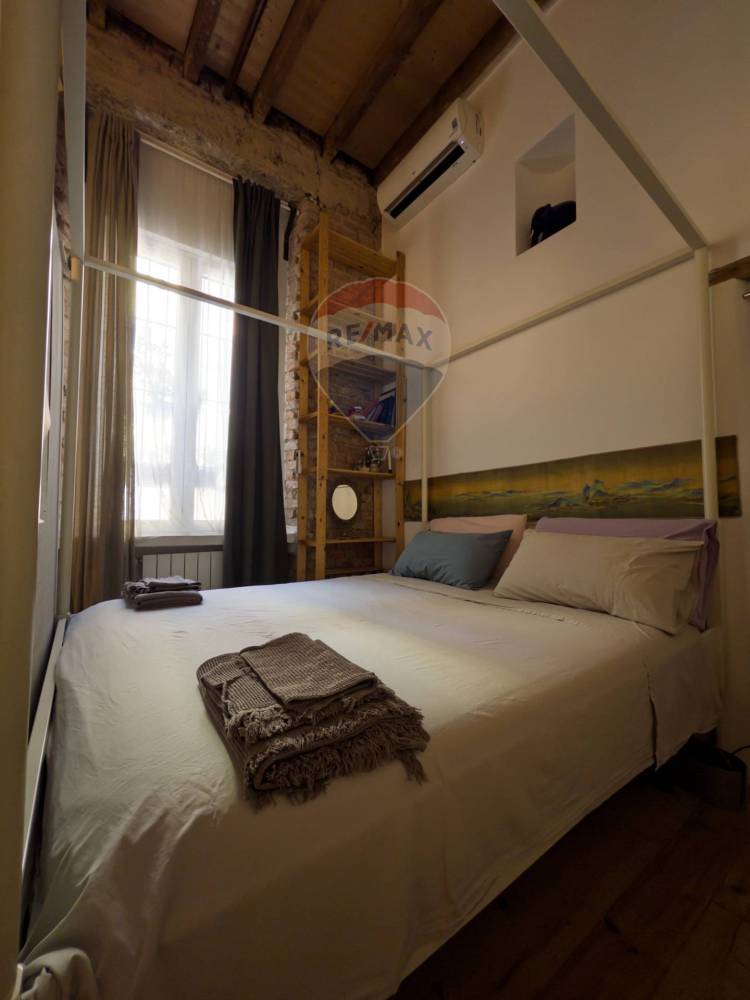 La zona notte è separata da un armadio su misura in legno, che funge da elegante divisorio e garantisce privacy senza interrompere la continuità stilistica. Qui trovano posto un letto matrimoniale e un angolo relax, in unatmosfera raccolta e confortevole.