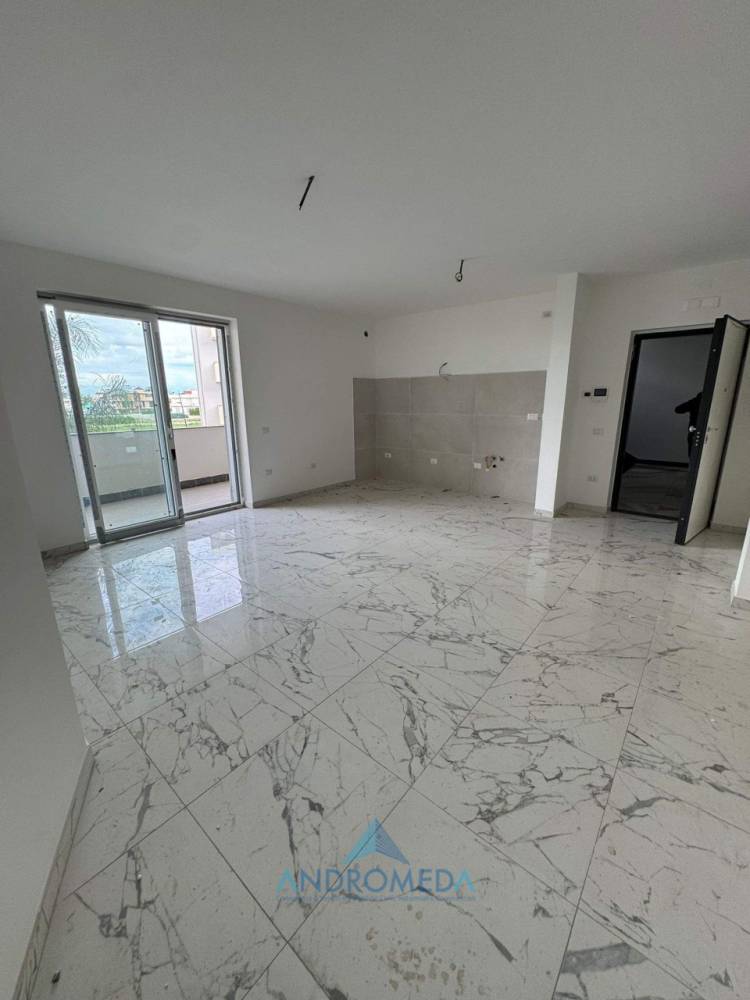 L’ appartamento si compone di: ampio salone living con cucina a vista, due camere da letto e due bagni.