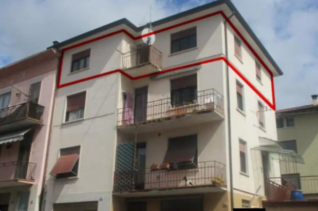Appartamento posto al piano terzo, composto da corridoio, cucina, bagno, due stanze, ripostiglio e piccolo poggiolo. Al piano terra si trova il posto auto, accessibile dalla pubblica via da cui l'edificio è distanziato da una piccola area esterna comune.
