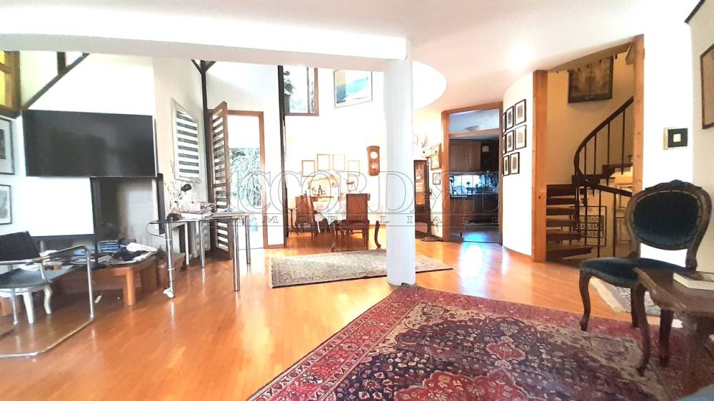 ABANO TERME, villa indipendente dallo stile unico caratterizzato da una struttura antisismica innovativa per l' epoca costituita da travi in ferro a vista lungo tutto il perimetro sorretti da pilastro centrale in calcestruzzo armato. Internamente, la soluzione presenta numerose finestre che favoriscono luminosità naturale costante che assieme al soppalco aggiungono profondità e fascino agli ambienti. Nel terrazzo coperto adiacente al soggiorno è presente un camino esterno che amplia le opportunità di convivialità in assoluta privacy. Il reparto notte comprende 3 camere da letto più un servizio mentre un garage triplo oltre un locale studio con entrata indipendente completano l' offerta. Esternamente spicca il giardino di 650 mq, completamente piantumato che circonda l'abitazione, ideale per momenti all'aperto con bambini e amici a quattro zampe. Altra caratteristica rilevante è la presenza di pozzo artesiano funzionante, elemento utile in contesti residenziale. Classe F. € 455.000