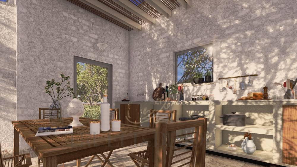 La cucina (zona ampliamento), equipaggiata con un'isola centrale, è connessa spazialmente a una parte della struttura più sporgente, caratterizzata da ampie finestre per godere del panorama circostante; inoltre questo design crea un ambiente luminoso e arioso, perfetto per cucinare e socializzare.
