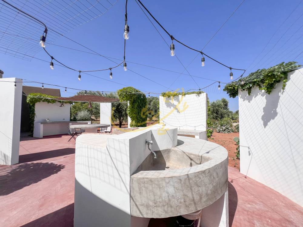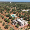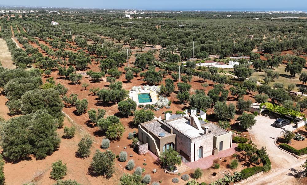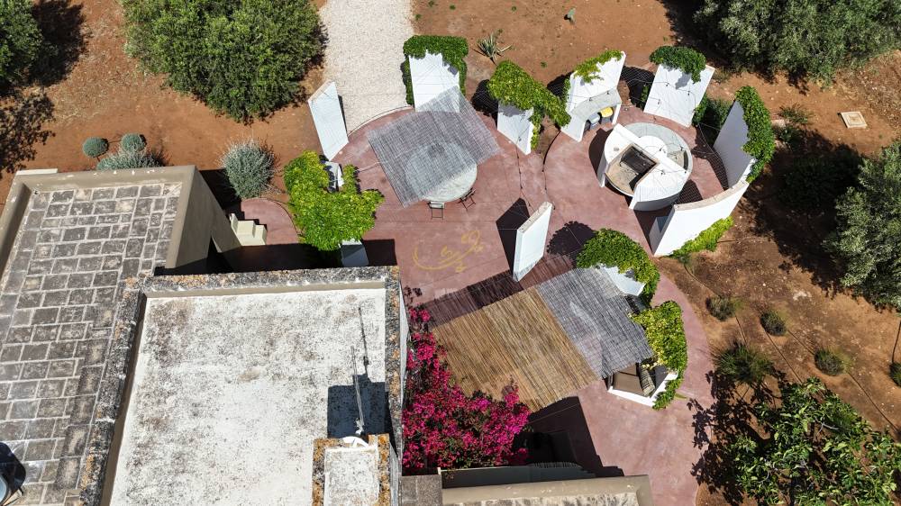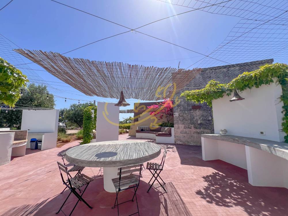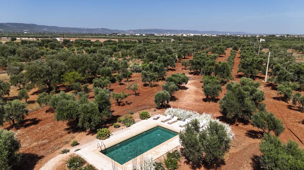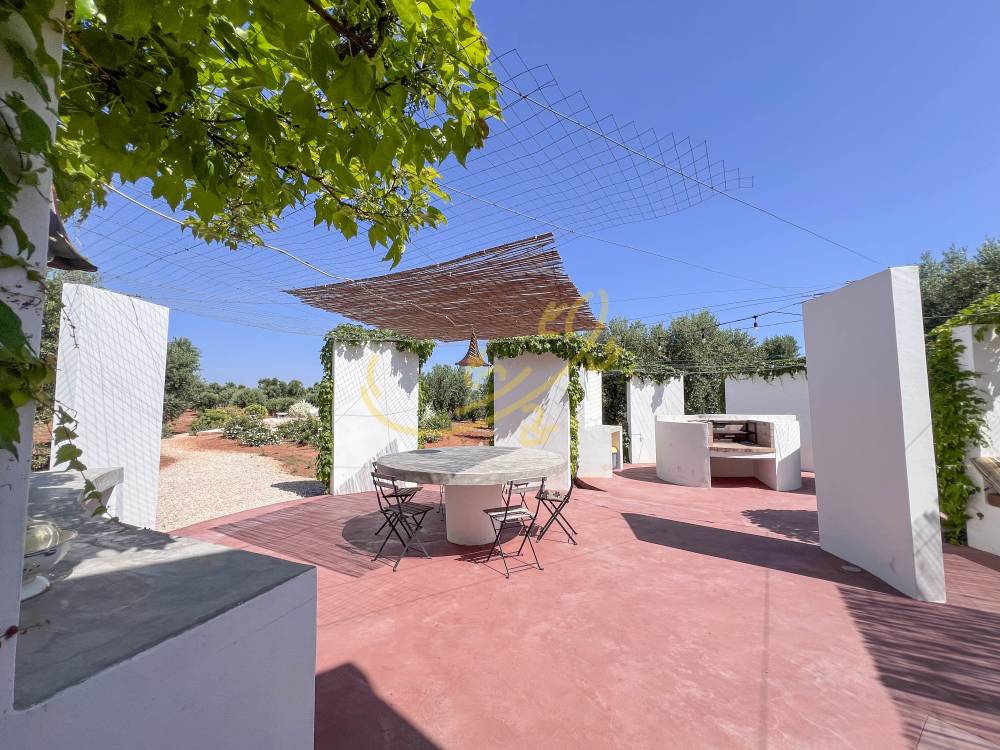 Completa la proprietà un ettaro di terreno con ulivi secolari ed alberi da frutto, una piscina di 40 mq con area solarium, un'ampia zona relax con due divani semicircolari, ricavati dalla pietra ed un'altra area attrezzata con barbecue, piano di lavoro con lavello, ed un piccolo deposito interrato di 10 mq a servizio della piscina.