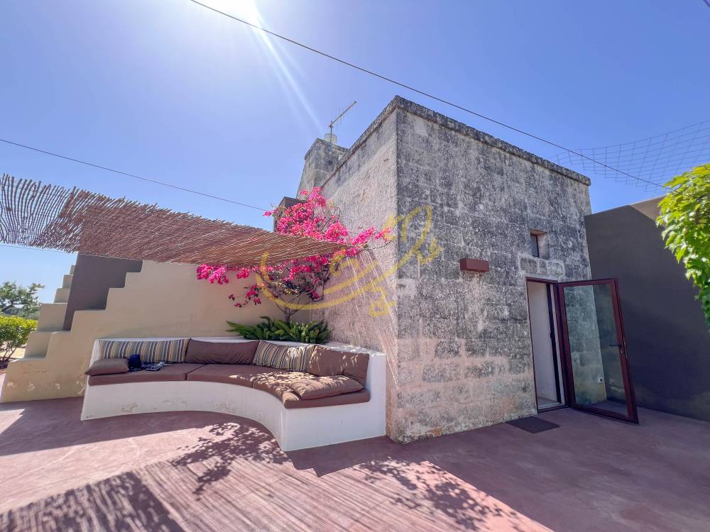 La villa è stata ristrutturata ed arredata con grande gusto in un contesto di terra rossa con un bellissimo giardino con piante ornamentali molto particolari alberi di carrubo ed ulivi muretti a secco in uno scenario molto raffinato.