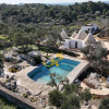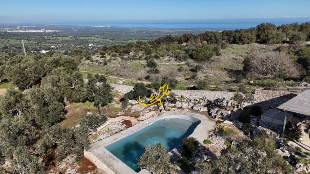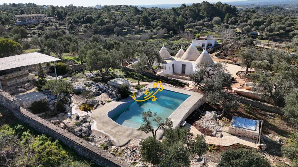 Intorno alla struttura del trullo fa da contorno un'ampia zona pavimentata in chianche, con cucina esterna, grande lavandino, forno a legna in pietra a secco, barbecue in muratura ed un enorme tavolo da pranzo composto da un blocco unico in pietra ideale per pranzi/cene all'aperto. Delimitano la zona esterna varie sedie in muratura ed una zona salotto composta da divani in pietra a secco. La piscina è di 40 mq. con ingresso in roccia e vista panoramica sia su tutta la Valle d'Itria, da cui è possibile ammirare i paesaggi di Cisternino, Locorotondo e Martina Franca, sia verso il mare da cui si ammira tutto l'Adriatico. Intorno alla piscina con doccia esterna calda sono posizionati letti matrimoniali prendisole, una zona living con pergola coperta da arelle con divani in muratura da cui si domina l'intero panorama. Completa l'offerta un pozzo artesiano privato.