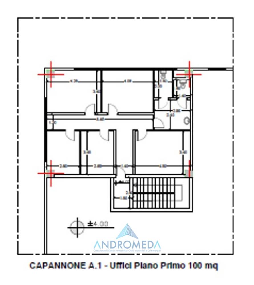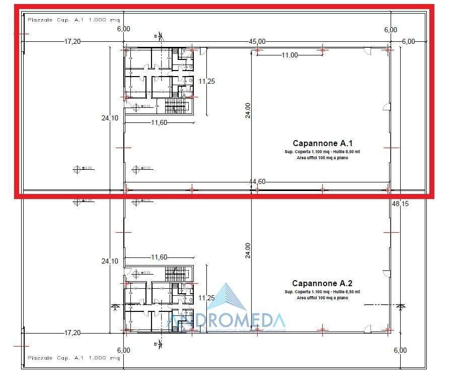 Piano terra di circa m² 1.100, con altezza di mt 10,15 al colmo e sotto trave di mt 8,50, di cui m² 100 destinati ad uffici, con altezza di mt 3,00;Primo piano soppalcato di circa m² 100, anch’esso adibito ad uso ufficio, con altezza di mt 3,00.Completa la proprietà un’ampia area esterna di circa m² 1.000, ideale per carico/scarico merci e movimentazione di mezzi pesanti.