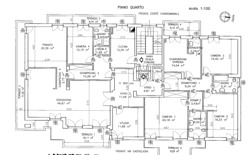 Appartamento situato a Busto Arsizio (VA), in Via G. Castiglioni, al quarto piano. L'unità si compone di ampio soggiorno, locale pranzo, quattro camere, studio, cucina, guardaroba con piccola lavanderia, tre bagni, ripostiglio, atrii e disimpegni di distribuzione, oltre a quattro terrazzi. Completa la proprietà due vani cantina al piano seminterrato. L'accesso principale è diretto dall'ascensore condominiale, mentre un ingresso secondario si trova dal pianerottolo delle scale comuni. Completa il lotto un box auto.