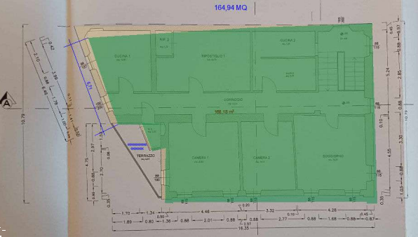 Il primo immobile è posto al primo piano con soggiorno- pranzo- cucina camera ripostiglio, bagno terrazzo e disimpegno; il secondo immobile è posto al piano secondo con soggiorno, due camere, cucina, bagno, ripostiglio, wc , disimpegno e terrazzo.Troviamo inoltre un negozio di 13mq e due magazzini di 18mq e 22mq situati al piano terra.