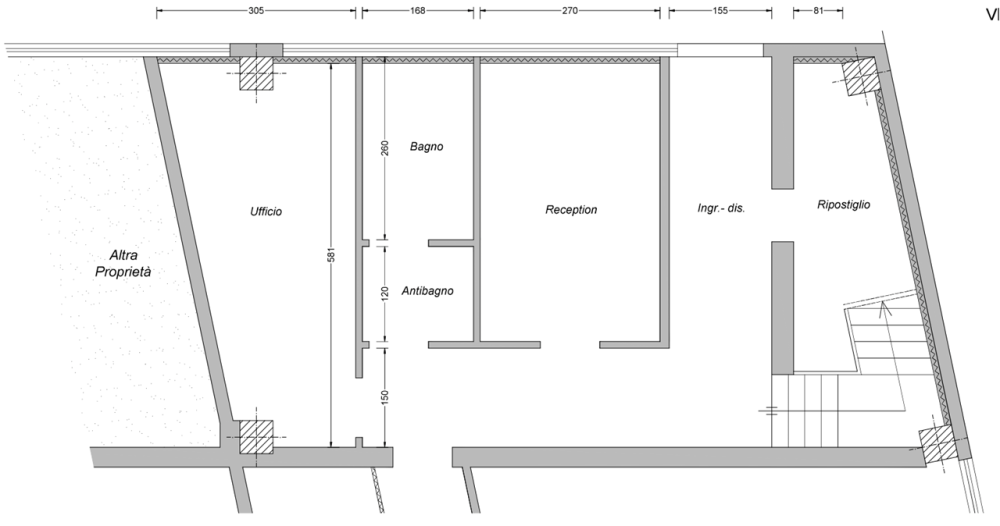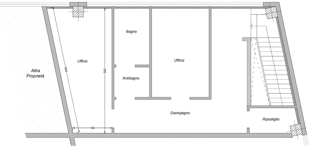 La zona uffici di 140mq è composta al piano terra da ingresso, due uffici, servizi, ripostiglio e disimpegno; al piano primo troviamo due uffici, servizi, ripostiglio e disimpegno.