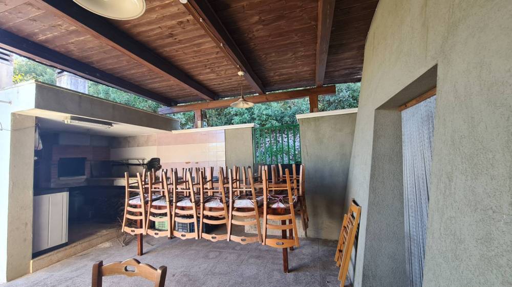 Questo la rende fresca e piacevole anche nei mesi più caldi. Inoltre vi è una zona chiusa da una veranda in legno completa di forno e barbecue.