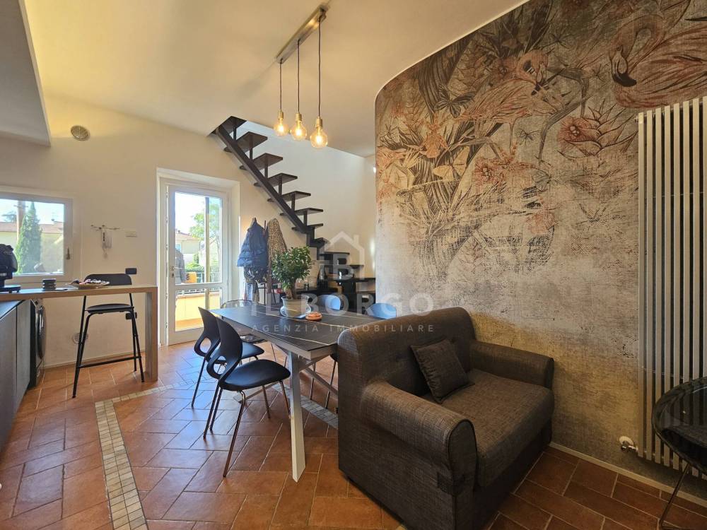 L'unità è posta al primo piano, accessibile tramite terrazzo a comune e si apre sulla luminosa zona giorno con angolo cottura a vista, bagno finestrato con vasca elegantemente rifinito e dotato di ripostiglio dove è riposta la caldaia a condensazione. La zona notte posta al piano superiore raggiungibile tramite scale a vista rende l'appartamento moderno e raffinato. Un comodo disimpegno accoglie una camera singola/studio e una camera matrimoniale con affaccio sul verde circostante oltre al bagno, anch'esso finestrato e dotato di box doccia doppio. Un posto auto privato accessibile tramite cancello automatizzato.