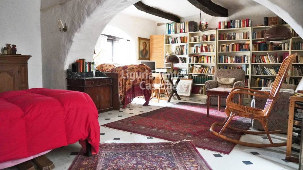 Lingresso della casa in vendita ad Imperia conduce a un accogliente salone caratterizzato da soffitti a volta e dettagli in pietra che richiamano il fascino autentico della tradizione ligure.