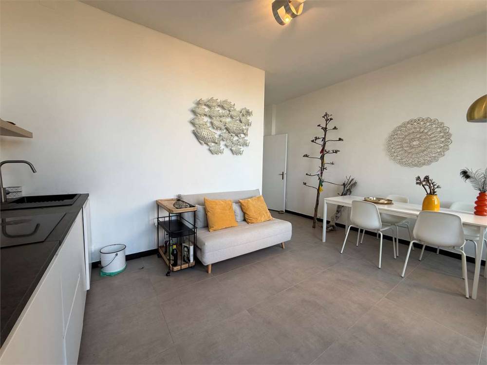 L'appartamento, ideale come seconda casa al mare, offre spazi contenuti ma ben organizzati: un soggiorno con angolo cottura, zona pranzo e salotto affacciato su un ampio balcone vivibile, una camera matrimoniale con bagno privato, un bagno per gli ospiti e una stanza jolly da utilizzare come studio o seconda cameretta.