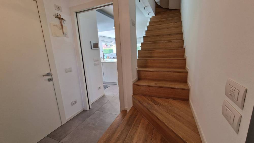 l'ingresso si apre su un' ampia e luminosa zona giorno caratterizzata da finiture di alta qualità e da un design moderno ed elegante, affacciata da un portico esterno e un giardino di proprietà ideali per trascorrere piacevoli momenti in famiglia e con gli amici. Completa il piano un bagno;