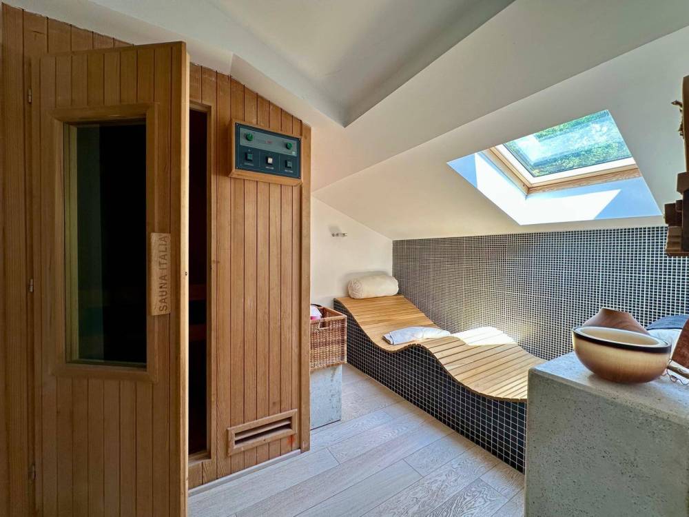 Al secondo piano troviamo un appartamento con ingresso soppalcato in vetro, cucina abitabile,camera matrimoniale, zona relax con sauna e bagno con vasca idromassaggio.