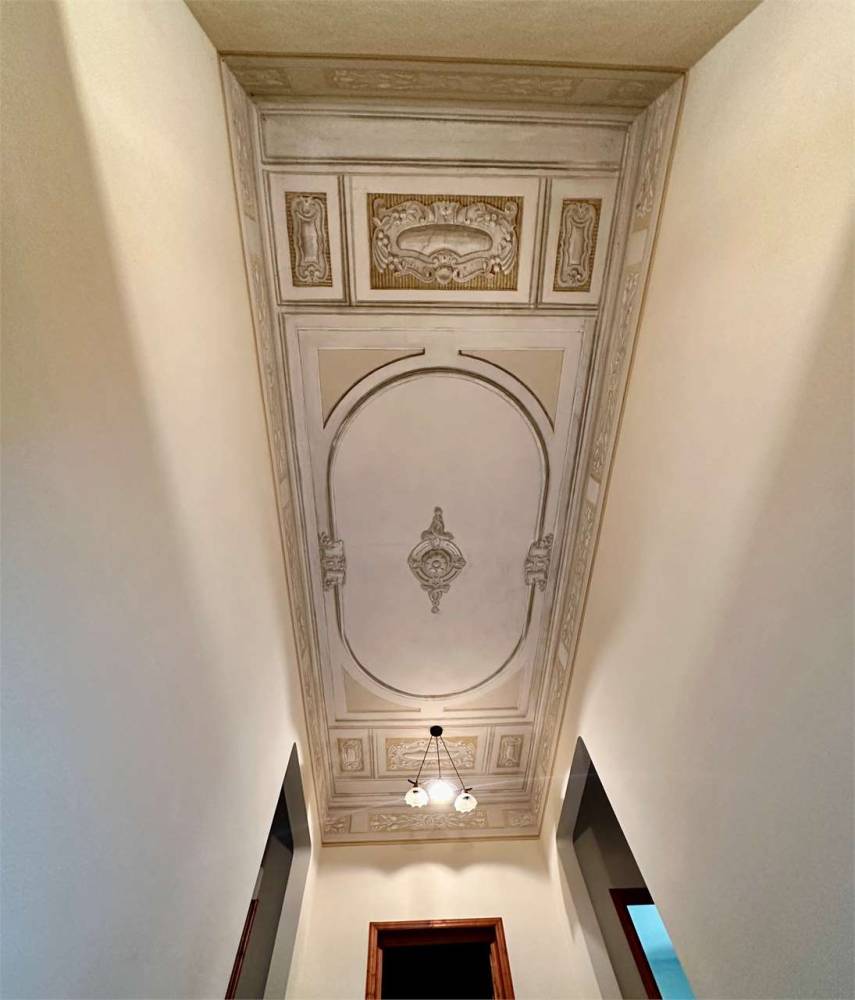 Gli Interni: L'ingresso, leggermente rialzato di tre gradini, si apre su un corridoio che conduce alla zona giorno. Il piano terra ospita una luminosa sala, una sala da pranzo caratterizzata da un suggestivo caminetto e un'ampia cucina abitabile con accesso diretto al giardino. Completa il livello una pratica cantina interna. Salendo al primo piano tramite una scala impreziosita da soffitti affrescati, si raggiunge un pianerottolo con un imponente portone in legno che dà accesso a una splendida terrazza. Questo piano è dedicato alla zona notte, composta da quattro camere matrimoniali, uno studio con terrazzo privato e due bagni con doccia.