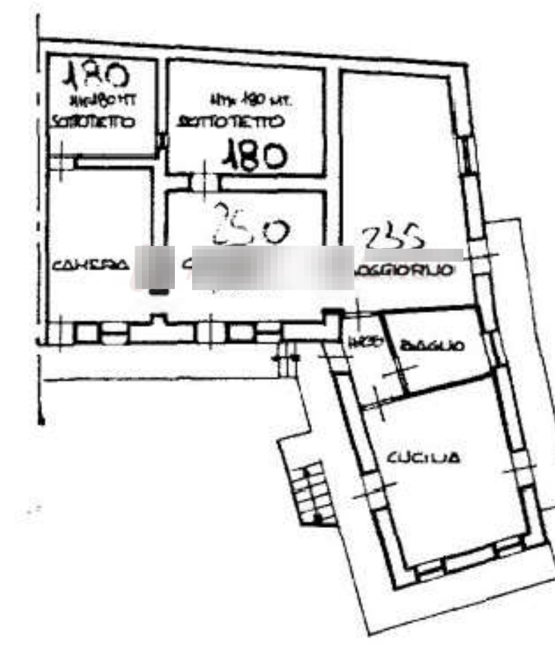 - cucina, soggiorno, due camere, due locali sottotetto, bagno e disimpegno,