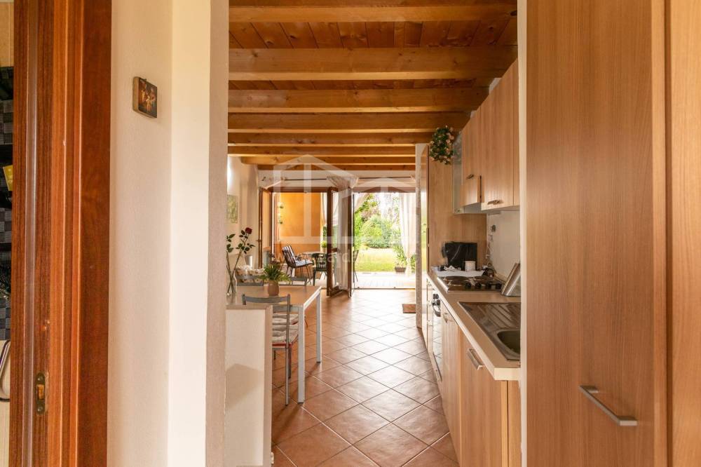 PIANO TERRA: ingresso su zona soggiorno, con cucina a vista in open-space, servito da porta finestra per accesso al giardino antistante privato; bagno finestrato con vasca/doccia.
