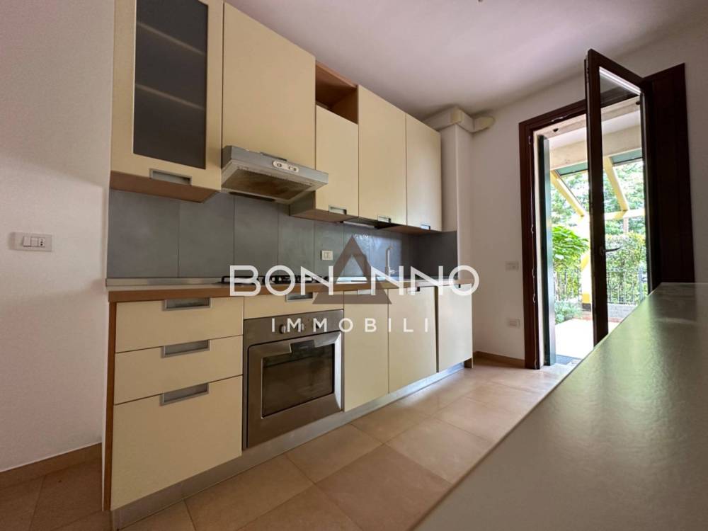 piano terra con giardino privato all'entrata, luminosa zona giorno semi-separata dalla cucina affacciata al portico esterno che si trova nella parte posteriore dell'immobile ed un bagno finestrato.