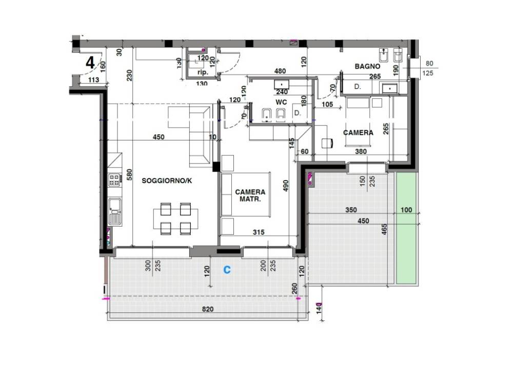 Palazzo ARIANNA, contemporaneo edificio residenziale all'avanguardia delle tecniche costruttive con impianti di ultima generazione altamente performanti. nLa posizione è molto strategica in quanto, se pur posta in un'area riservata lontana dal traffico, dista soli 400 m dalla stazione FS, 500 m dal supermercato and quot;Il Gigante and quot;, 200 m dalle scuole primarie Aldo Moro di via Redipuglia, è servita anche da una farmacia che è posta proprio fronte casa ed è inoltre molto comoda per i collegamenti con i paesi limitrofi.nnIl progetto vede la realizzazione di 11 unità abitative poste al piano primo, secondo e terzo, oltre autorimesse e cantine al piano terra con la creazione anche di parcheggi esterni. nGli appartamenti sono di grandi metrature e dotati tutti di favolosi terrazzi! nPalazzo ARIANNA mira a soddisfare i clienti più esigenti con un progetto ambizioso che racchiude un'accurata progettazione degli spazi interni che risultano essere funzionali, spaziosi e ben luminosi, oltre alle favolose terrazze di grandi metrature, ideali per trascorrere momenti conviviali o di relax nella bella stagione, il tutto in un contesto condominiale signorile e di stile architettonico contemporaneo.nPalazzo ARIANNA sarà realizzata con tecnologie e materiali all'avanguardia dell'edilizia moderna, la struttura principale infatti sarà realizzata col sistema ARGISOL che assicura elevate prestazioni in tema di risparmio energetico, oltre ad essere classificata come struttura antisismica, saranno utilizzati impianti di ultima generazione, privi di metano e 100% elettrici, come il riscaldamento e raffrescamento a pavimento mediante pompa di calore, impianto VMC ventilazione meccanica controllata, impianto di deumidificatore integrato degli ambienti, impianto fotovoltaico, oltre l'impiego di serramenti ad elevato isolamento termico ed acustico. nTutte queste caratteristiche costruttive permetteranno di classificare Palazzo ARIANNA nella più alta CLASSE ENERGETICA A.nInoltre ogni appartamento del Palazzo ARIANNA è personalizzabile sia nelle finiture, sia nella disposizione degli spazi interni, in base alle proprie esigenze.nPalazzo ARIANNA è stato appositamente progettato PRIVO di appartamenti al piano terra con giardini, scelta volta ad assicurare un contesto condominiale raffinato e sempre curato. nDisponibili box doppi, box singoli e posti auto interni oltre a cantine.nPIANO PRIMOnAPP. 4: TRE LOCALI di 100 mq con terrazza di 42 mq | and euro; 265.000 nAppartamento di 100 mq c.a. suddiviso in ingresso, grande zona living soggiorno / cucina open space servita da favolosa terrazza di ben 42mq, corridoio che conduce alla zona notte suddivisa in ripostiglio / lavanderia, camera matrimoniale e camera singola servite dal terrazzo e due bagni. Abitazione con esposizione est/sud/ovest.n***CONSEGNA DICEMBRE 2026***nBOX DOPPI: and euro; 40.000 (BOX 3,8,9,10)nBOX SINGOLI E MEZZO: and euro; 30.000 (BOX 2)nBOX SINGOLI: and euro; 20.000nP. AUTO: VENDUTInCANTINA and euro; 7.000nSPESE ALLACCIAMENTI+ ACCATASTAMENTO and euro; 5.000 - Maggiori Dettagli: Climatizzato, Porta blindata, Insonorizzazione