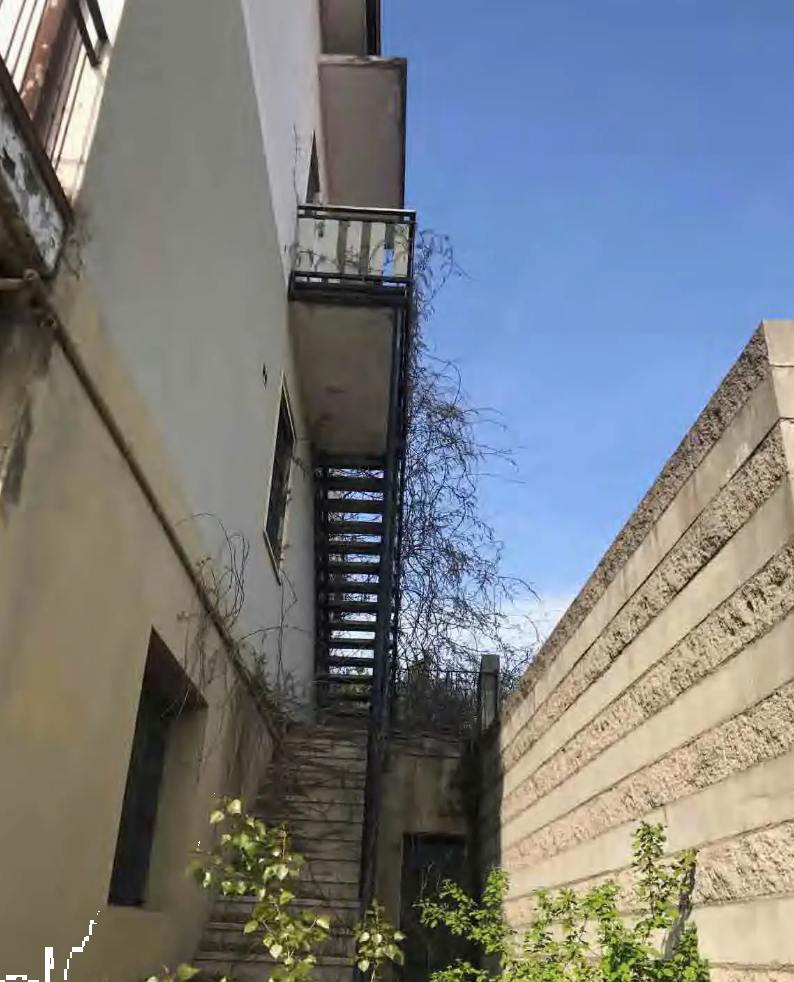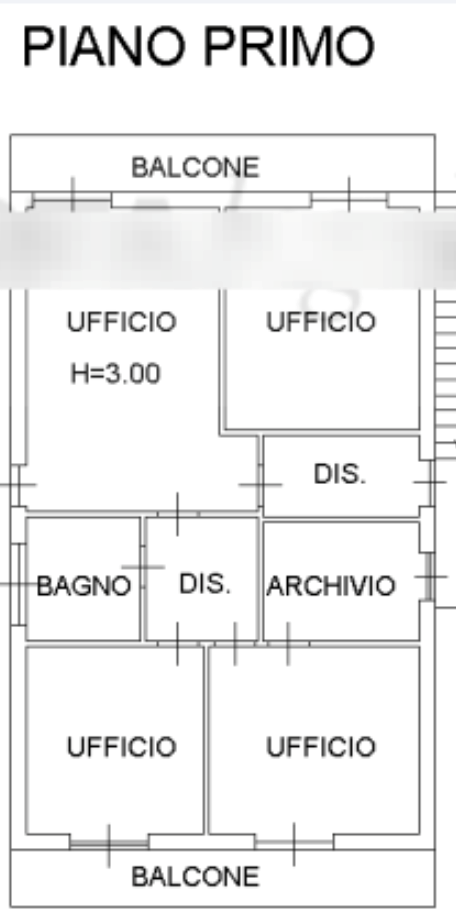 -ufficio al piano primo come segue: accesso diretto da corte/parcheggio esterno attraverso blocco scala che conduce ad un ballatoio esterno dal quale si accede a corridoio e successivamente a due locali uso ufficio. Vi