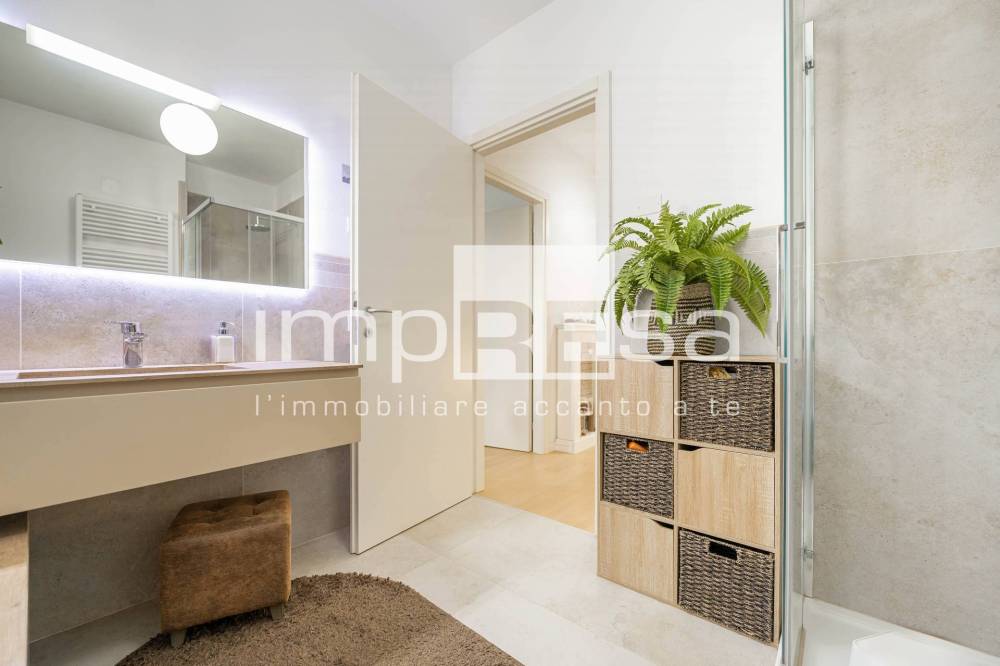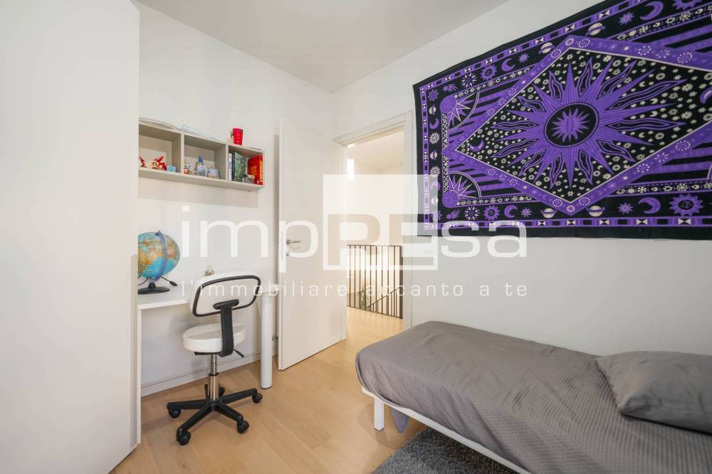 Sempre al piano terra troviamo inoltre il bagno con doccia e zona lavanderia, una palestra allestita nel portico sul retro da cui si esce tramite una porta finestra della cucina o la vetrata scorrevole del soggiorno.