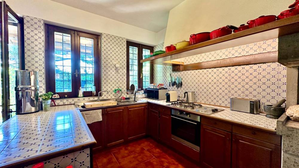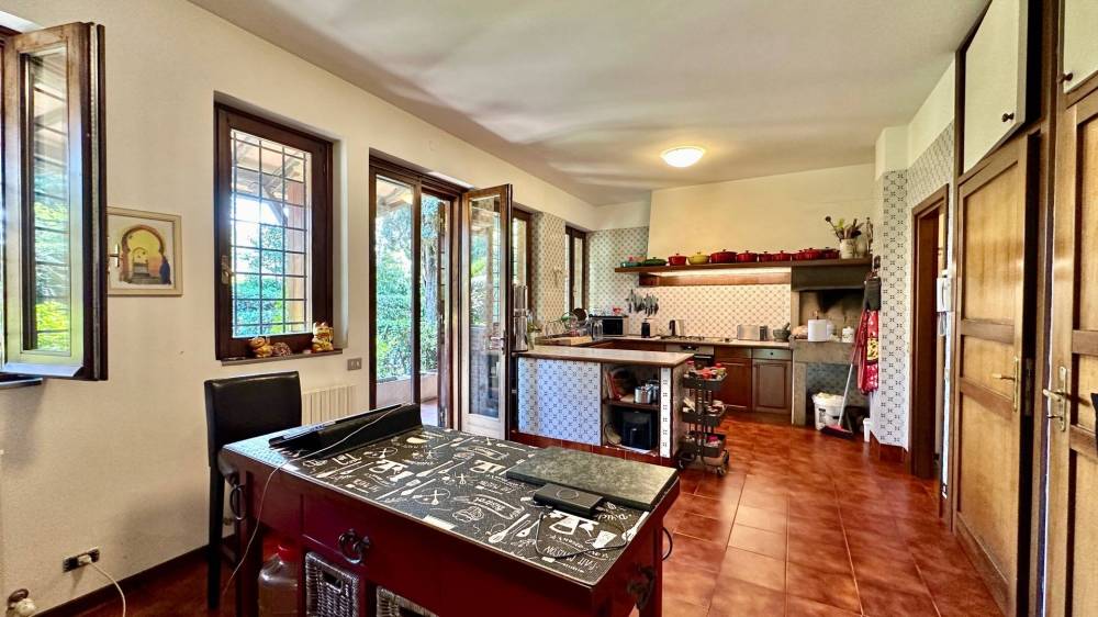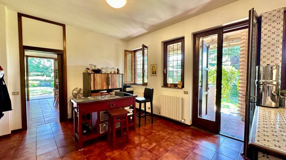 Appena varcata la soglia, sarete accolti da un grande salone, caratterizzato da ampie vetrate che si aprono sul verde esterno, creando unatmosfera luminosissima e accogliente, ideale per trascorrere momenti indimenticabili con la famiglia e gli amici. Accanto al salone troverete una cucina impeccabilmente organizzata, completa di una zona lavoro e uno spazio dedicato al pranzo, oltre a una comoda dispensa. Anche questo ambiente affaccia sul patio, offrendo così un accesso diretto a un angolo di paradiso allaperto, perfetto per rilassarsi o per cene estive.